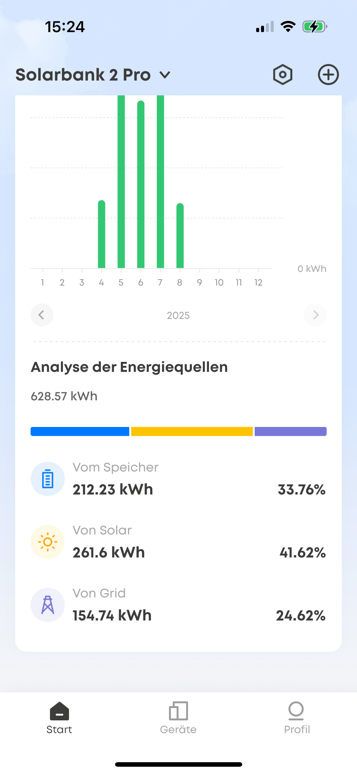 Seit der Inbetriebnahme läuft das System stabil und effizient. Die bifazialen Solarpanels auf dem nach Süden ausgerichteten Balkon liefern bei gutem Wetter mehr als genug Energie – der Speicher ist oft schon frühen Mittag voll. Das spiegelt sich auch in der persönlichen Verbrauchsstatistik wider: