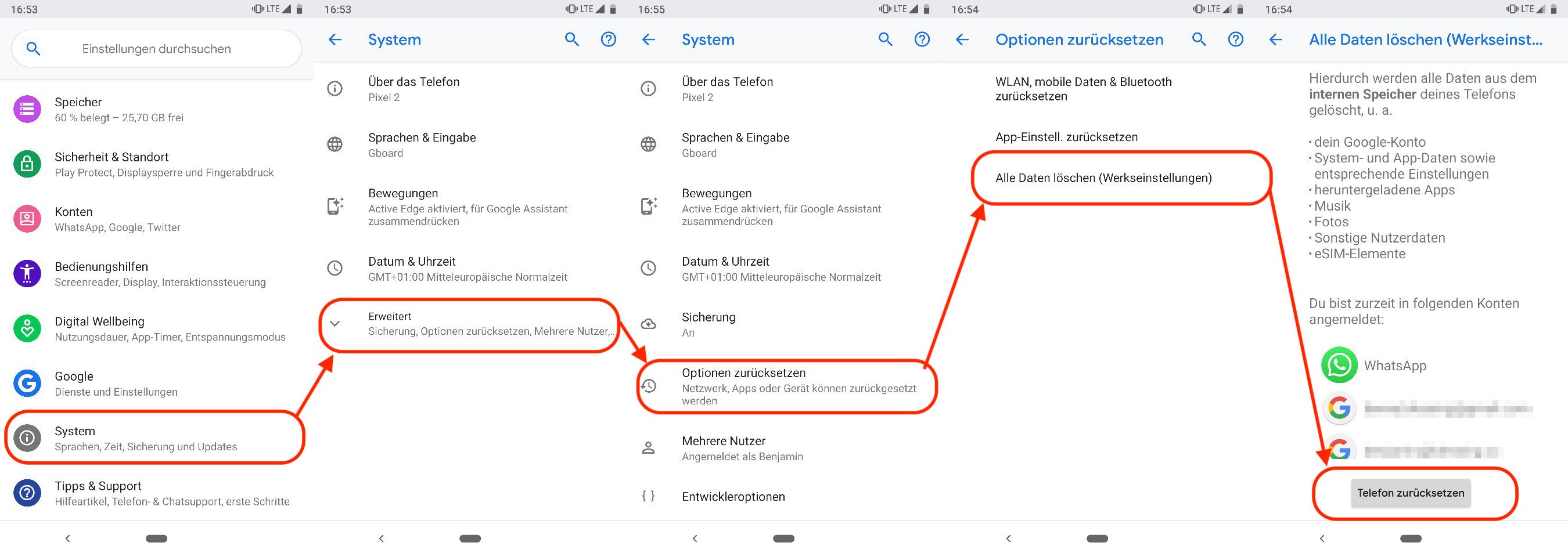 Einstellungen –> System –> Erweitert –> Option zurücksetzen –> Alle Daten löschen (Werkseinstellungen) –> Telefon zurücksetzen