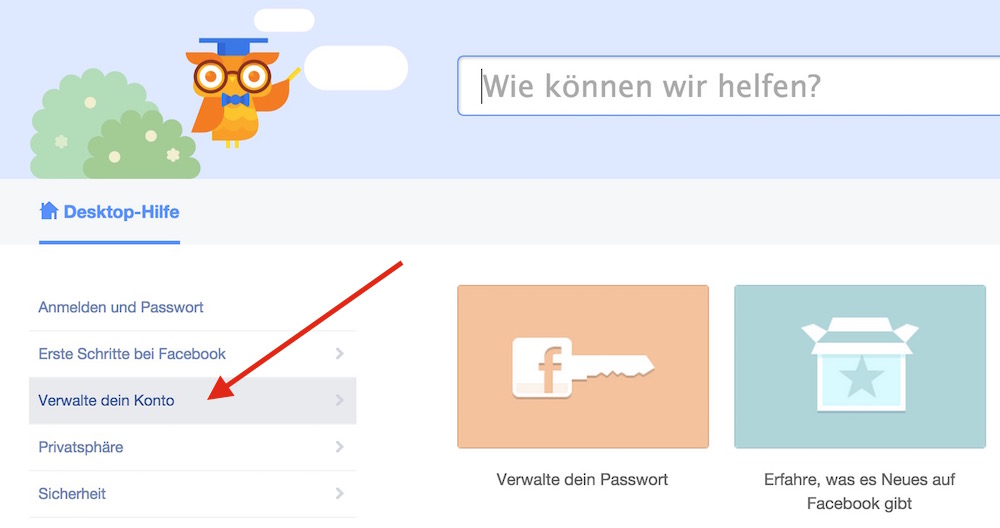 Im Hilfebereich muss die Option Verwalte dein Konto aufgerufen werden.