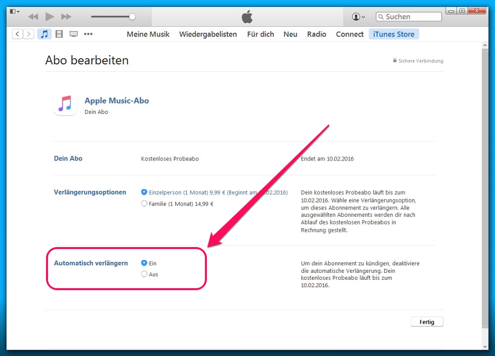 Unter Abonnements verwalten bietet iTunes die Möglichkeit das Musik-Abo zu Apple Music zu verändern. Hier lässt sich auch vom Einzelpersonenabo zum Familienabo wechseln. Wer Apple Music nicht automatisch verlängern möchte, muss im entsprechenden Abschnitt Aus wählen. Dann endet das kostenlose Probeabo automatisch nach drei Monaten.