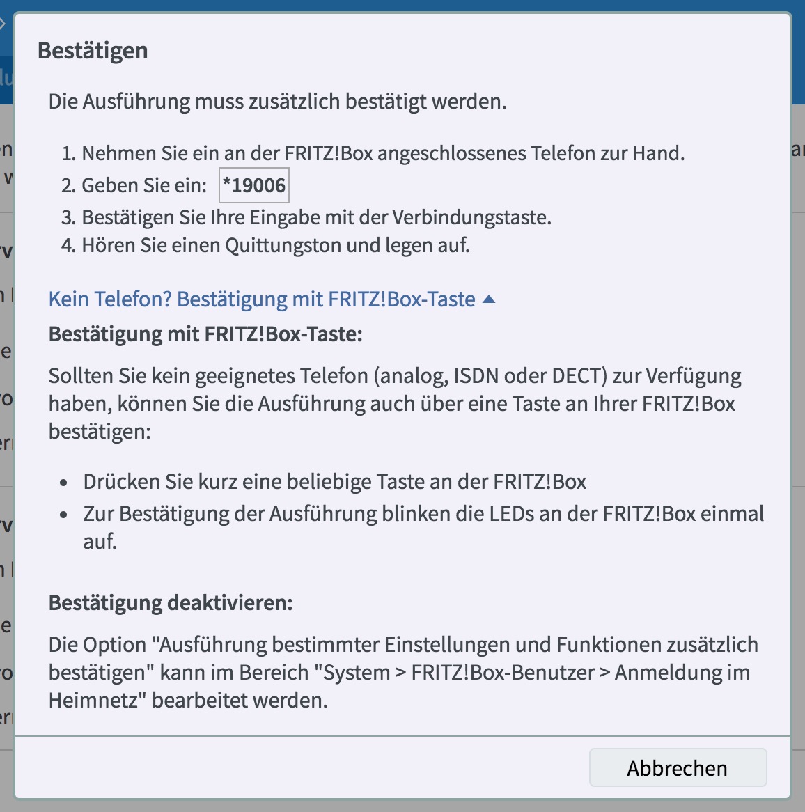 Nach der Änderung des DNS-Servers fordert die FritzBox zur manuellen Bestätigung der Änderung auf. Das geht entweder über ein an die FritzBox angeschlossenes Telefon oder über eine beliebige Taste an der FritzBox.