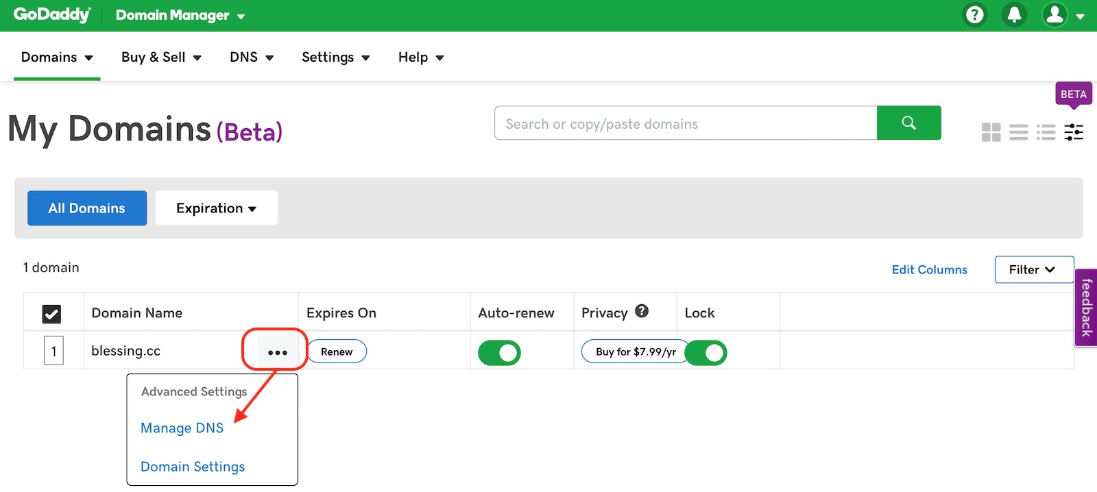 Meldet euch bei GoDaddy.com an und ruft dort My Domains auf. Im Bild unten seht ihr die neue Domain-Verwaltung in der Beta-Version. Zu jeder Domain bekommt ihr die Möglichkeit, die DNS-Einträge zu verwalten. Siehe Option Manage DNS.