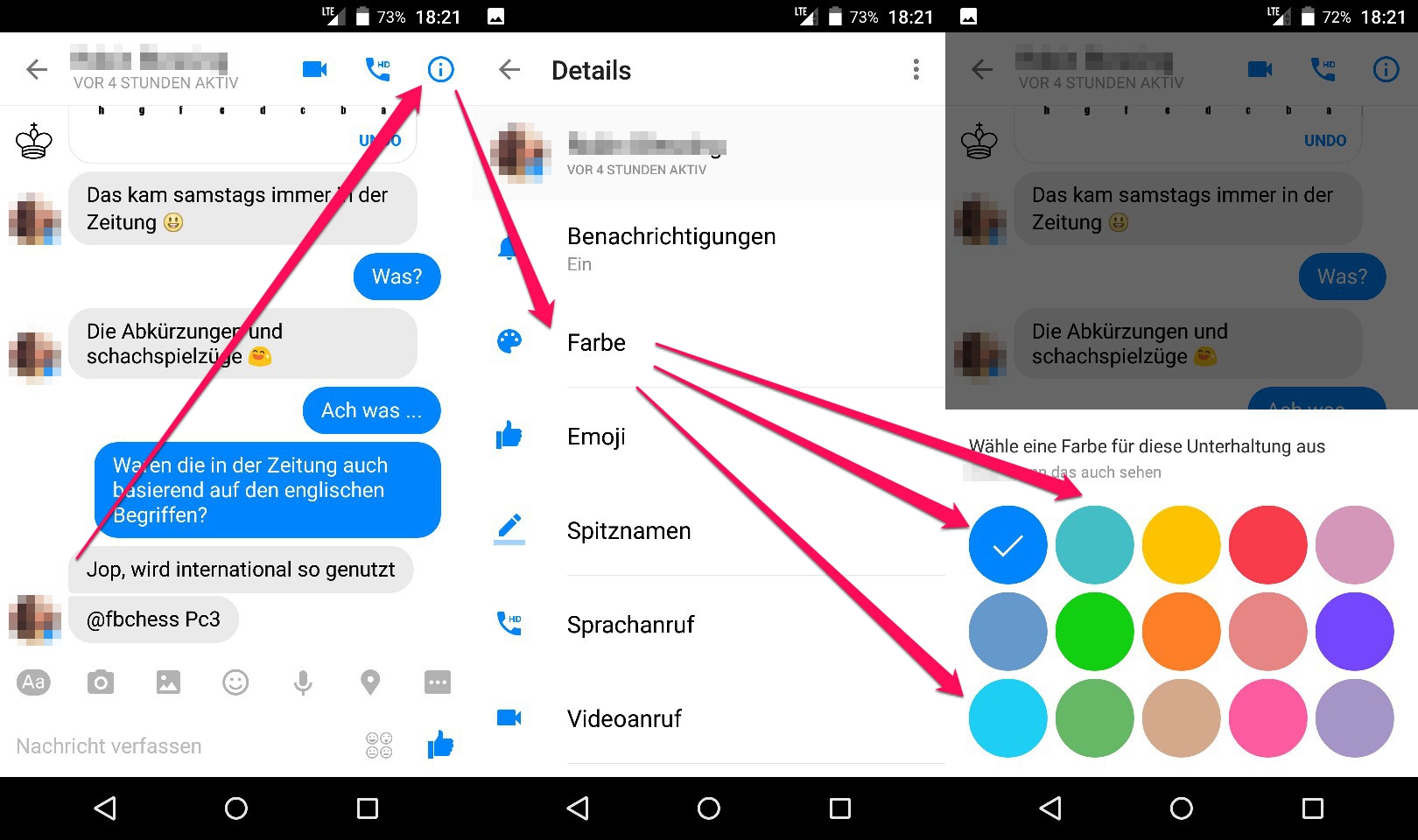 Insgesamt stehen dem Anwender 15 unterschiedliche Farben zur Auswahl. Die Änderung sieht auch der Gesprächspartner in der Facebook Messenger App. Durch die Änderung der Farbe im Facebook Messenger wird in der Unterhaltung alles in der neuen Farbe angezeigt. Auch die Symbole in den Details zur Unterhaltung sind zukünftig in einer anderen Farbe.