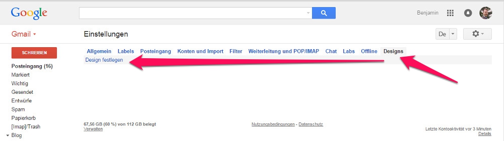 In den Einstellungen zu Gmail befindet sich der Reiter Designs. Hier kann über die Option Design festlegen das Auswahlfenster geöffnet werden.