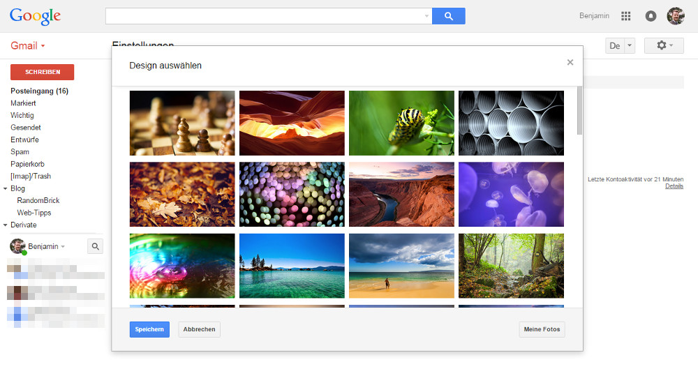 Von bunten Hintergrunden über einfarbige Designs stehen dem Gmail Anwender alle Möglichkeiten zur Auswahl. Zusätzlich ermöglicht Google das Hochladen von eigenen Bildern.
