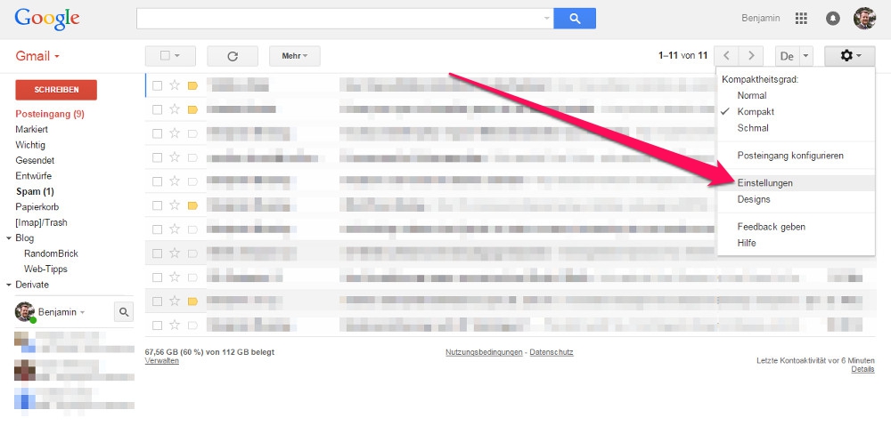 Über das Zahnrad erscheint ein Dropdown-Menü über das sich die Einstellungen zu Gmail aufrufen lassen.