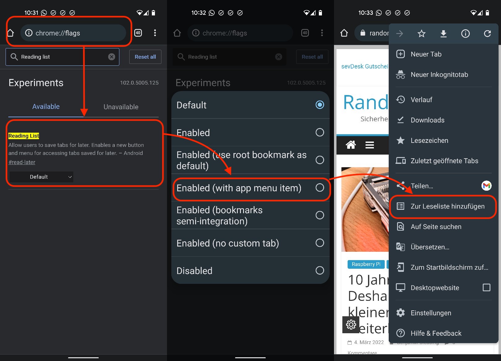 Anschließend startet Google Chrome auf deinem Android neu. Nach dem Neustart findest du über die drei Punkte im Menü die Option „Zur Leseliste hinzufügen“. Websites, die du zur Leseliste hinzufügst, werden über dein Google Konto über alle Geräte synchronisiert. Den Tab mit der Website kannst du anschließend schließen. Wenn du deine Einträge in der Leselist sehen möchtest, findest du diese unter Android als Option unter „Lesezeichen“.