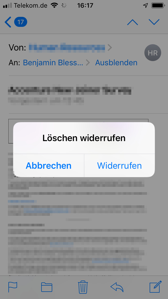 Wurde eine E-Mail von euch versehentlich auf dem iPhone gelöscht, reicht ein kurzes Schütteln des Smartphones. iOS zeigt dann den Hinweis „Löschen widerrufen“ an. Damit holt ihr die letzte gelöschte E-Mail ohne Umwege aus den Papierkorb zurück in den Eingang. Damit ein versehentliches Wiederherstellen unterbunden wird, fragt iOS vorher.