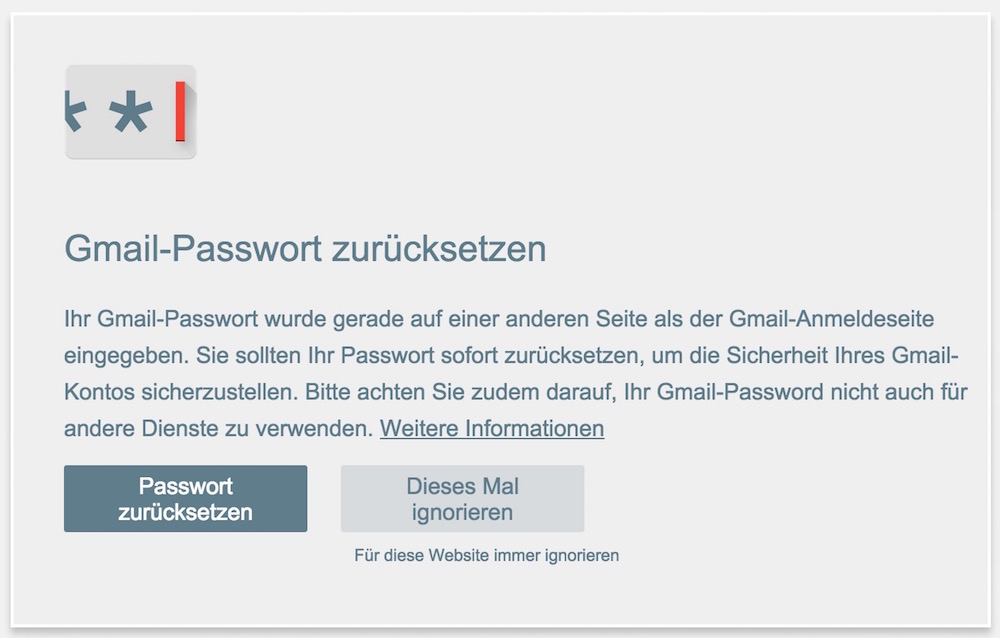 Dabei wird nicht nur überprüft, ob dass Gmail-Passort auf einer anderen Seite eingeben wird, sondern die Passwörter werden verglichen und der Nutzer gewarnt, wenn der selbe Passwort auch für andere Dienste im Web verwendet wird. Die Erweiterung bietet dann die Option, das Google-Passwort zu ändern oder die Meldung zu ignorieren.