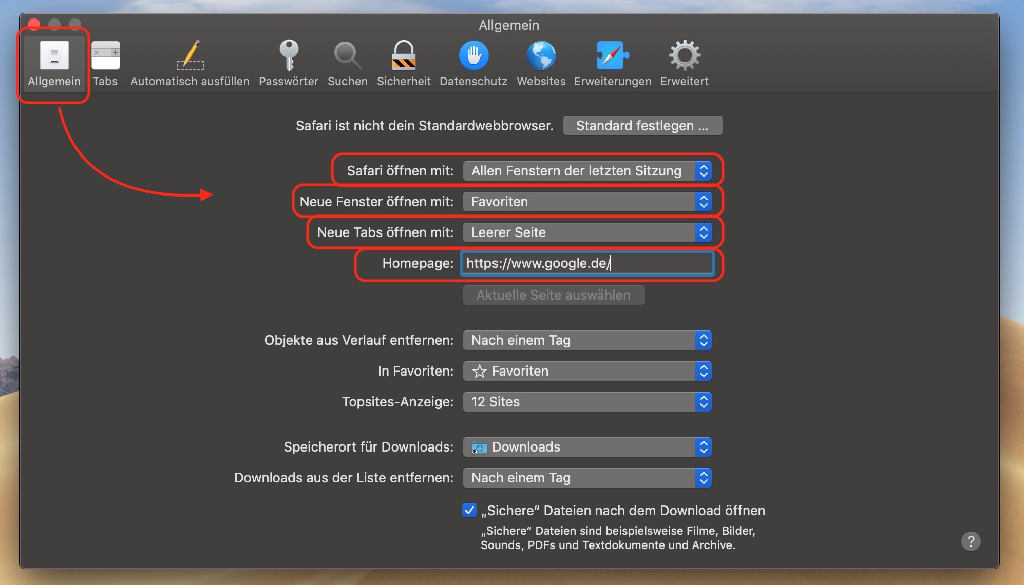 Zum Ändern der Startseite in Safari muss der Browser gestartet werden. Anschließend gehst du wie folgt vor: