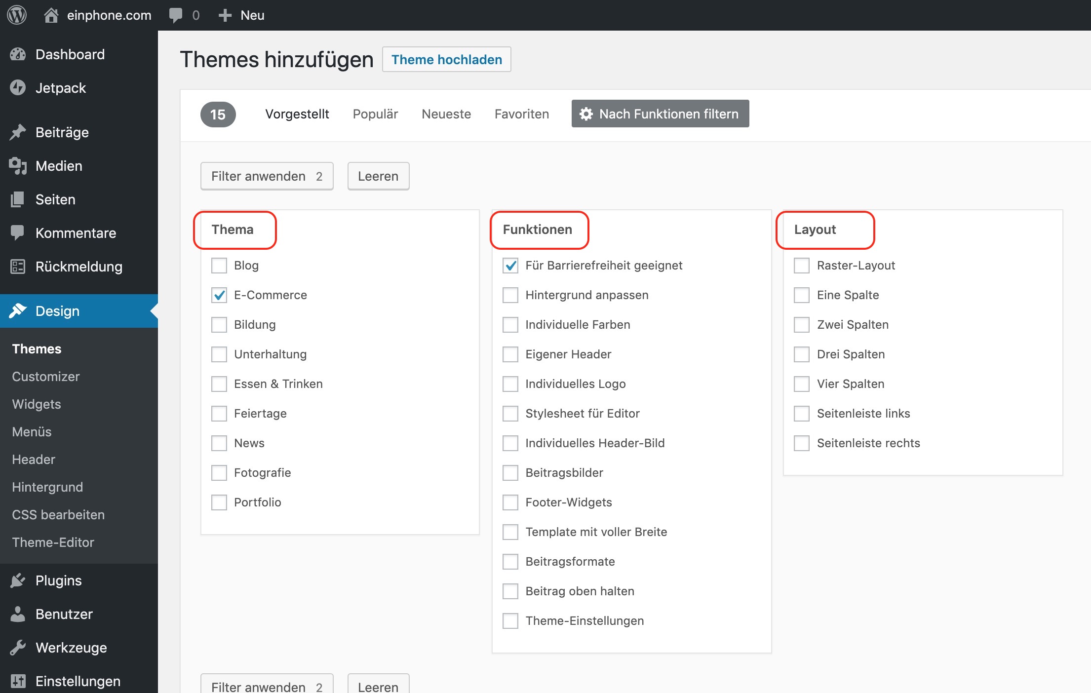 Du suchst nach einem bestimmten Theme oder einer speziellen Funktion. Dann nutze die Filter-Funktion.